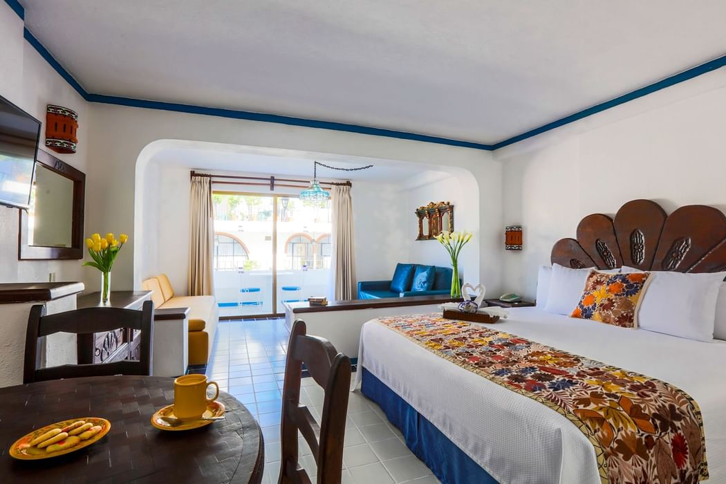 Relax in your spacious, stylish suite featuring a King size bed, private balcony and a separate living room equipped with a sofa and a kitchenette. Each Suite offer the perfect combination of contemporary and traditional Mexican décor. Guest amenities include air conditioning with individual controls, a marble bathroom and an electronic safe.